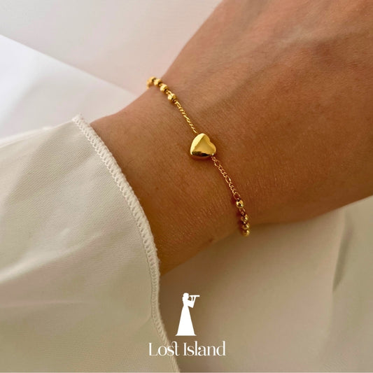 Pulseira Coração Maciço e Bolinha Banho Ouro 18k