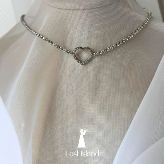Colar Chocker Riviera com Pingente Coração Vazado Fixo Riviera Banho Ródio