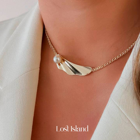 Colar Chocker Asa Leque com Pérola Banho Ouro 18k
