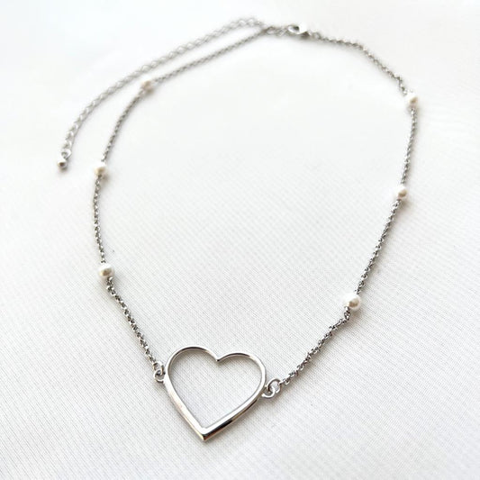 Colar Pingente Coração Vazado Fixo Banho Ródio com mini pérolas