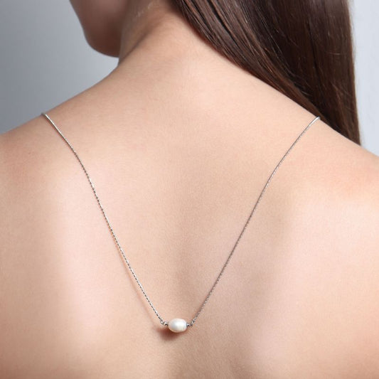Colar Escapulário Premium com Pingente Pedra Cristal Rosa e Pingente Pérola Banho Ródio