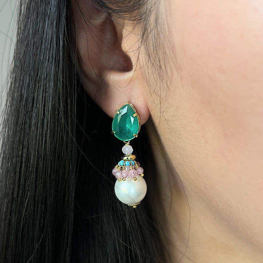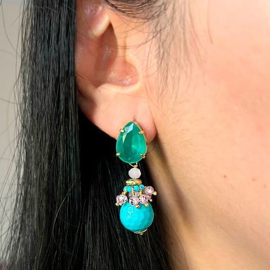 Brinco com Pedra Turquesa e Pérolas Banho Ouro 18k
